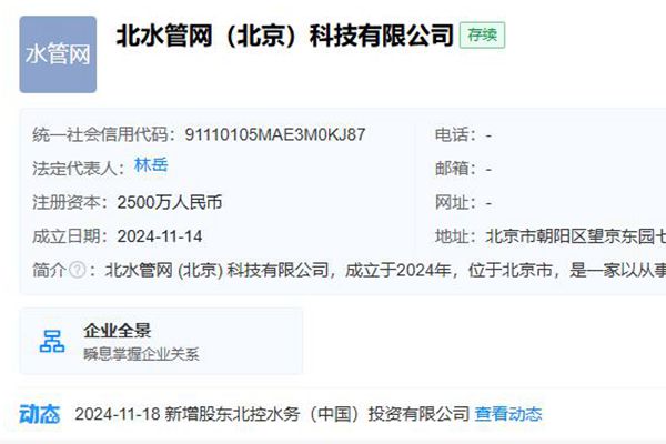 日前,北水管网(北京)科技有限公司注册成立。注册资本2500万元人民币,其中北控水务持股45%,为控股股东,北京源朔科技中心(有限合伙)持股30%,太原畅达华美新材料科技有限公司持股20%。 经营范围如下: 【一般项目】技术服务、技术开发、技术咨询、技术交流、技术转让、技术推广;市政设施管理;工程和技术研究和试验发展;智能水务系统...