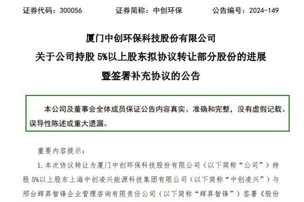 11月15日,厦门中创环保科技股份有限公司(简称:中创环保)发布关于公司持股5%以上股东拟协议转让部分股份的进展暨签署补充协议的公告。根据公告,中创环保持股5%以上股东中创凌兴拟将其持有的公司股份1629万股(占股份总数的4.22%)转让给辉昇智锋。此次股份转让为同一控制人控制的不同主体之间的协议转让,不触及要约收购。 补充协议对股...