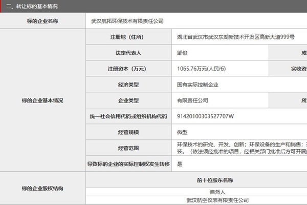 来自北京产权交易所的消息显示,武汉航拓环保技术有限责任公司47.8832%股权拟挂牌转让,预披露结束日期为2024年11月19日。 武汉航拓环保技术有限责任公司,注册资本1065.76万元(人民币),属于国有实际控制企业,经营范围—— 环保技术的研究、开发、创新;环保设备的生产和销售;环保工程设计、施工;表...