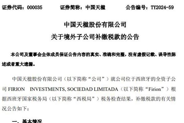 中国天楹股份有限公司(简称:中国天楹)近日发布《关于境外子公司补缴税款的公告》,其位于西班牙的全资子公司Firion根据西班牙国家税务局税务检查结果,补缴了西班牙公司税2099.79万欧元、滞纳金278.64万欧元,合计缴纳2378.43万欧元,折合约人民币1.86亿元。 公告显示,西税局确认Firion不存在故意偷税、漏税行为,未...