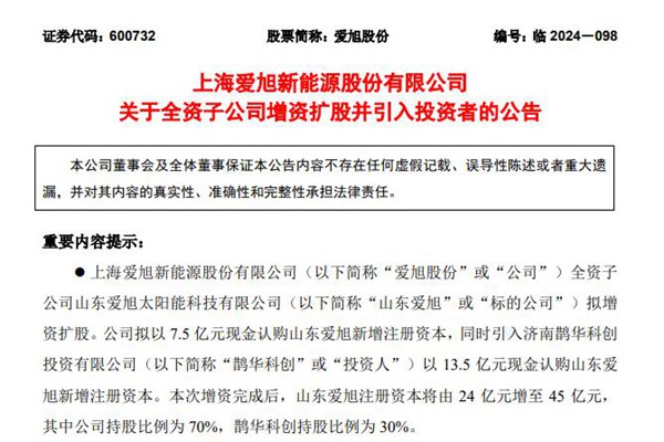 9月26日,光伏巨头上海爱旭新能源股份有限公司(简称:爱旭股份)宣布,其全资子公司山东爱旭太阳能科技有限公司(简称“山东爱旭”)已拟定增资扩股计划,旨在通过引入21亿元巨额投资,为公司的发展与市场扩张注入强劲动力。 根据公告,爱旭股份将投资7.5亿元人民币现金认购山东爱旭新增的注册资本,同时引入济南鹊华科创投...