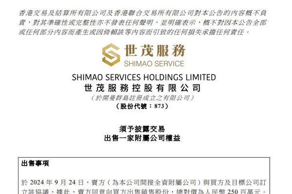 9月24日,港股上市企业世茂服务控股有限公司(简称:世茂服务)宣布,公司已与无锡远游环境科技有限公司达成协议,出售无锡市金沙田科技有限公司(下称“目标公司”)60%的股权,交易对价为2.5亿元人民币。 目标公司无锡市金沙田科技有限公司,为一家总部位于江苏省无锡市的智慧环保整体解决方案公司,目前由世茂服务拥有6...