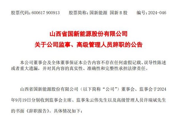 朱云伟辞去山西省国新能源股份有限公司(以下简称“国新能源”)第十届监事会主席、监事职务。许瑞斌申请辞去公司副总经理职务。 9月19日,国新能源发布公告称,公司董事会、监事会于9月19日分别收到监事会主席、监事朱云伟先生以及高级管理人员许瑞斌先生的书面《辞职报告》。 朱云伟先生因工作调整的原因,申请辞去公司第...
