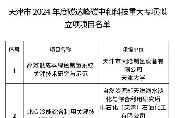 近日,天津市科技局公示2024年度碳达峰碳中和科技重大专项拟立项项目,高效低成本绿色制氢系统关键技术研究与示范、LNG冷能综合利用关键技术研究与集成应用等七个项目入选。 下面是原文↓ 市科技局关于天津市2024年度碳达峰碳中和科技重大专项拟立项项目的公示 根据《天津市科技计划项目管理办法》,经初审、形式审查、专家评审等...