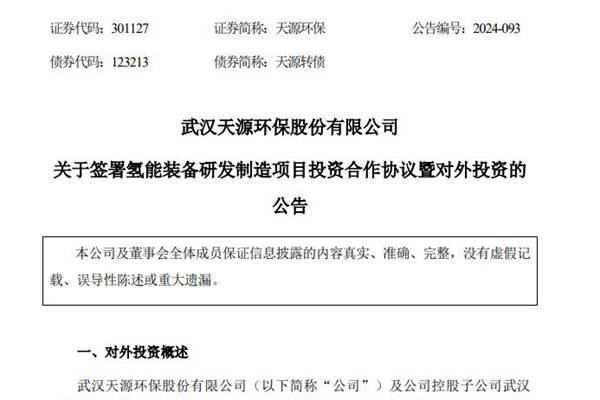 武汉天源环保股份有限公司(简称:天源环保)近日公告称,公司及控股子公司武汉天源能源有限公司与扬州市江都区人民政府本着合作共赢的原则,拟就投资建设“氢能装备研发制造基地项目”相关事宜签署《氢能装备研发制造基地项目投资合作协议》。根据前述协议约定,项目总投资约10亿元,分两期进行,由公司控股子公司在扬州市江都区设立...
