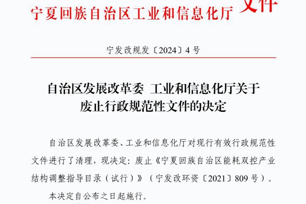 宁夏回族自治区发展和改革委员会公开《自治区发展改革委 工业和信息化厅关于废止行政规范性文件的决定》,废止《宁夏回族自治区能耗双控产业结构调整指导目录(试行)》(宁发改环资〔2021〕809号),自公布之日起施行。...