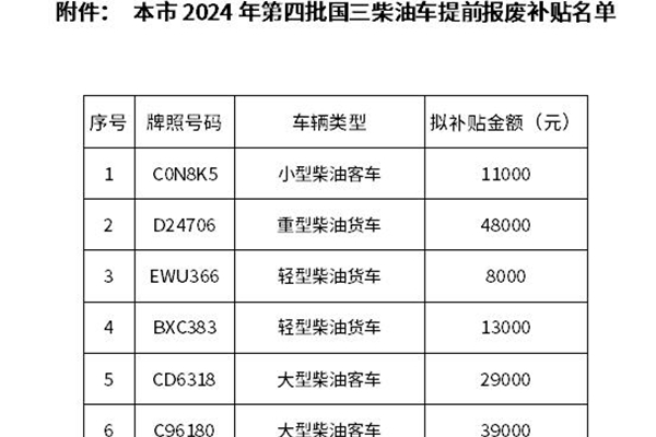 关于本市2024年第四批国三柴油车提前报废补贴名单的公示 根据《上海市生态环境局、市发展改革委、市交通委、市商务委、市公安局、市财政局、市机管局关于发布〈上海市进一步鼓励国三柴油车提前报废补贴实施办法〉的通知》(沪环规〔2022〕9号)规定,我局会同相关部门对提出本市国三柴油车提前报废补贴的车辆进行了审核。现将经过初审符合要求拟予补贴的...