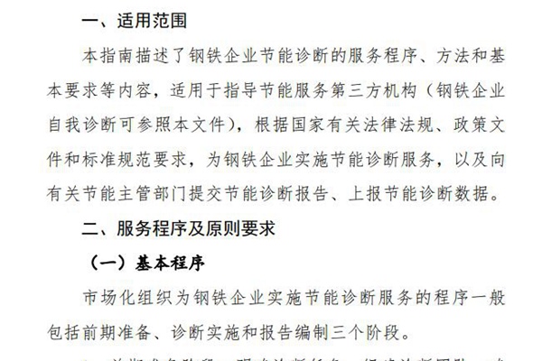 《钢铁行业节能诊断服务指南》发布,描述了钢铁企业节能诊断的服务程序、方法和基 本要求等内容,适用于指导节能服务第三方机构(钢铁企业 自我诊断可参照本文件),根据国家有关法律法规、政策文 件和标准规范要求,为钢铁企业实施节能诊断服务,以及向 有关节能主管部门提交节能诊断报告、上报节能诊断数据。 指南要求,钢铁企业节能诊断涉及的能源种类...