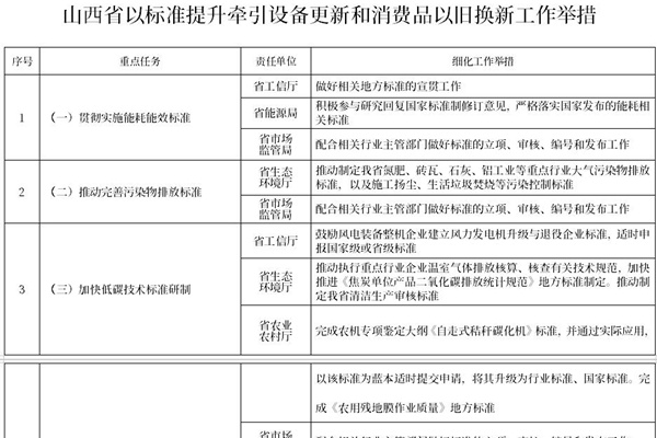 关于印发《山西省以标准提升牵引设备更新和消费品以旧换新工作方案》的通知 各市人民政府、省人民政府各委、办、厅、局: 《山西省以标准提升牵引设备更新和消费品以旧换新工作方案》已经省人民政府同意,现印发给你们,请认真贯彻执行。 省市场监管局 省发展改革委 省工信厅 省生态环境厅 ...