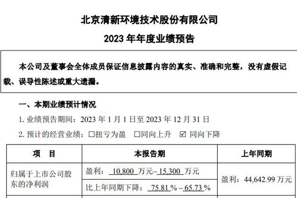 北京清新环境技术股份有限公司(简称:清新环境)近日发布了《2023年年度业绩预告》,预计实现归属于上市公司股东的净利润1.08亿元~1.53亿元,同比下降65.73%~75.81%;基本每股收益0.0755元~0.1075元。 对于业绩变动主要原因,清新环境解释称,系公司与年审会计师深入沟通后,结合公司销售模式及业务实际情况,对个别...