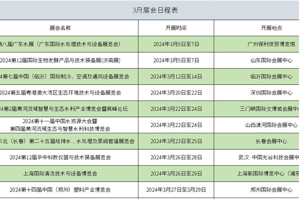 开始啦,开始啦,一年之计在于春,这个3月的环保盛会岂能错过!环保在线特意整理了一份环保展会的行程表,快来收藏吧↓ 1、第八届广东水展(广东国际水处理技术与设备展览会) 时间:2024年3月5日至7日 地点:广州保利世贸博览馆 亮点:广东水展是华南地区的高品质展会,深耕8年,纵深整合了广东、福建、湖南、江西、四川、云南...