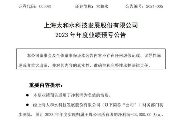 上海太和水科技发展股份有限公司(简称:太和水)发布《2023年年度业绩预亏公告》,预计2023年年度实现归属于母公司所有者的净润-23,000万元,与上年同期(法定披露数据)相比,将出现亏损;归属于母公司所有者的扣除非经常性损益后的净利-23,000万元。 太和水认为,本期业绩预亏主要有三个原因,一是受宏观经济、产业政策、竞争环境及...