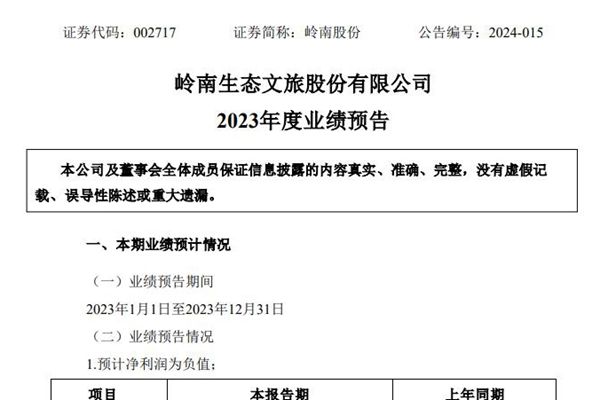 岭南生态文旅股份有限公司(简称:岭南股份)近日发布《2023年度业绩预告》,预计2023年实现归属于上市公司股东的净利润亏损70,000 万元–95,000 万元;扣除非经常性损益后的净利润亏损68,000万元–92,000万元;基本每股收益亏损0.42 元/股–0.57元/股。 岭南股份表示,2...