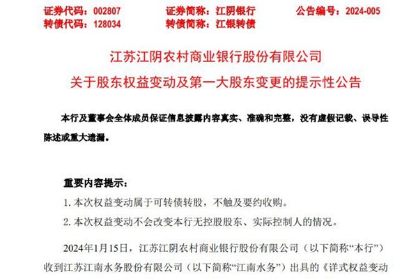 1月16日,江苏江阴农村商业银行股份有限公司(简称:江阴银行)发布《关于股东权益变动及第一大股东变更的提示性公告》。公告显示,江阴银行近日收到了江苏江南水务股份有限公司(以下简称“江南水务”)出具的《详式权益变动报告书》,江南水务通过持有的可转债转股的方式持有江阴银行141,819,494股股份,占其目前总股本...