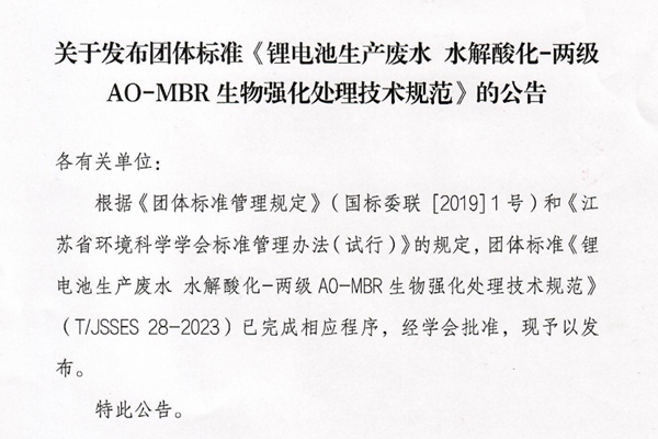 2023年3月30日,江苏省环境科学学会发布《锂电池生产废水 水解酸化-两级A/O-MBR生物强化处理技术规范》(T/JSSES 28—2023),该标准已于2023年4月30日启动施行。 文件规定了锂电池生产废水生物强化处理(水解酸化-两级A/O-MBR)的技术要求,适用于以三元锂电池和磷酸铁锂电池为主要产品的生产企业...