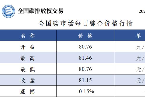 10月18日全国碳市场综合价格行情为: 开盘价80.76元/吨,最高价81.46元/吨,最低价80.76元/吨,收盘价81.15元/吨,收盘价较前一日下跌0.15%。 18日挂牌协议交易成交量264,999吨,成交额21,496,354.12元;大宗协议交易成交量14,089,638吨,成交额862,328,272.07元。 18...