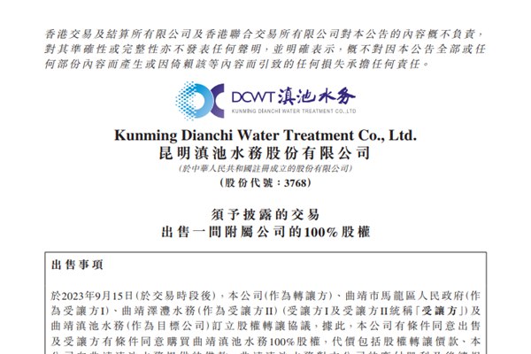 9月15日,昆明滇池水务股份有限公司(简称:滇池水务)发布公告称,公司(作为转让方)、曲靖市马龙区人民政府(作为受让方I)、曲靖泽沣水务(作为受让方II)(受让方I及受让方II统称"受让方")及曲靖滇池水务(作为目标公司)订立股权转让协议。 根据协议,公司将出售曲靖滇池水务100%的股权给受让方,并包括股权转让价款、借款、应付股利以...