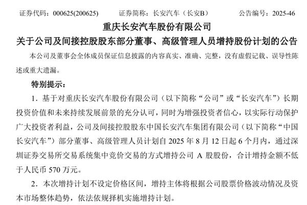 8月11日晚间,重庆长安汽车股份有限公司(简称:长安汽车)披露“公司及间接控股股东部分董事、高级管理人员增持股份计划”,增持主体为中国长安汽车现任全体董事、高级管理人员,以及公司部分董事、高级管理人员共计19人,拟通过深圳证券交易所交易系统集中竞价交易的方式增持,每人不低于人民币30万元,合计金额不低于人民币5...