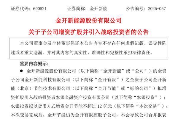 金开新能源股份有限公司(简称:金开新能)近日公告称,为进一步优化资本结构并增强资本实力,全资子公司金开有限之全资子公司金开新能(北京)节能技术有限公司(简称“金开节能”)拟增资扩股引入战略投资者农银投资。农银投资拟以货币方式增资金开节能不超过12亿元。交易完成后,金开节能仍为金开有限控股子公司,不会导致公司合并...