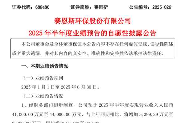 赛恩斯环保股份有限公司(简称:赛恩斯)近日发布《2025年半年度业绩预告的自愿性披露公告》。报告期内,赛恩斯预计实现营业收入人民币4.1亿元至4.4亿元,与上年同期相比,将增加5,399.29万元至8,399.29 万元,同比增加15.17%至23.59%;预计实现归属于母公司所有者的净利润人民币4,600.00万元至4,900.00...