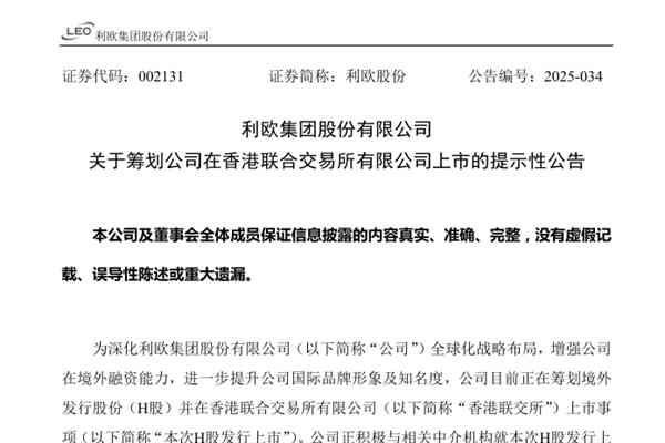 利欧集团股份有限公司(简称:利欧股份)7月23日公告称,为深化公司全球化战略布局,增强公司在境外融资能力,进一步提升公司国际品牌形象及知名度,公司目前正在筹划境外发行股份(H股)并在香港联合交易所有限公司(下称“香港联交所”)上市事项(下称“本次H股发行上市”)。目前,利欧股份正积极与相...