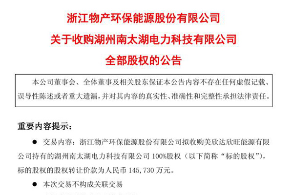 2025年07月17日,浙江物产环保能源股份有限公司发布《关于收购湖州南太湖电力科技有限公司全部股权的公告》。图源:物产环能公告 浙江物产环保能源股份有限公司拟收购美欣达欣旺能源有限公司持有的湖州南太湖电力科技有限公司100%股权,标的股权的股权转让价款为人民币145,730万元。 南太湖科技为浙江省内热电联产领域的成熟企业,以燃...