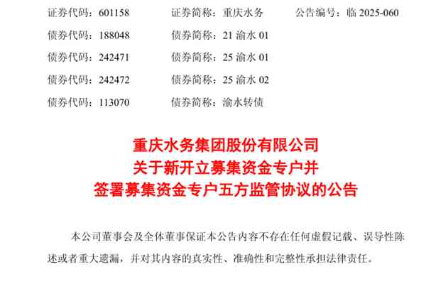 重庆水务集团股份有限公司(简称:重庆水务)近日公告称,为规范公司募集资金管理,保护投资者权益,公司与募投项目实施主体相关的子公司及保荐人、存放募集资金的商业银行签署了募集资金监管协议,对募集资金实施专户存储管理。 2025年7月16日,重庆水务及昆明渝润水务有限公司、重庆市豪洋水务建设管理有限公司江津分公司、申万宏源证券承销保荐有限...