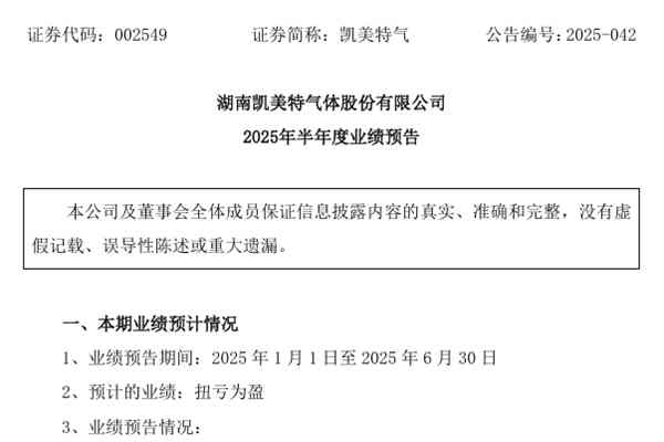 湖南凯美特气体股份有限公司(简称:凯美特气)近日发布《2025年半年度业绩预告》。报告期内,凯美特气预计实现归属于上市公司股东的净利润盈利4,500万元–6,300万元,上年同期亏损5,594.41万元;扣除非经常性损益后的净利润盈利4,000万元–5,500万元,上年同期盈利52.18万元。图源:凯美特气公告...