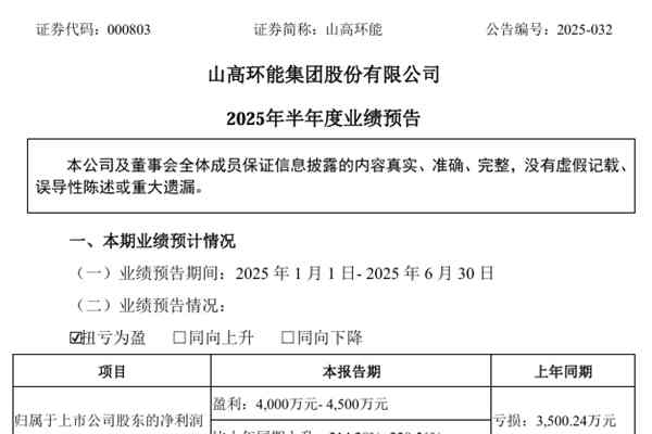 山高环能集团股份有限公司(简称:山高环能)近日发布《2025年半年度业绩预告》。报告期内,山高环能预计实现归属于上市公司股东的净利润盈利4,000万元- 4,500万元,比上年同期上升214.28%- 228.56%,上年同期亏损3,500.24万元;扣除非经常性损益后的净利润盈利3,600万元- 4,100万元,比上年同期上升2,1...