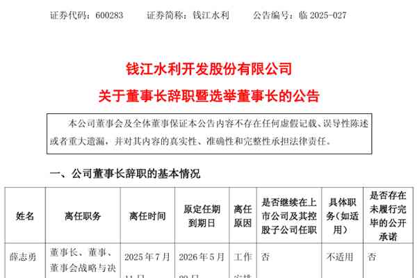 钱江水利开发股份有限公司(简称:钱江水利)近日公告称,因工作安排的原因,薛志勇先生辞去公司董事长、董事、董事会战略与决策委员会召集人、董事会提名委员会委员职务,辞职后,薛志勇先生将不再担任公司任何职务。 7月11日,钱江水利召开第八届董事会第十五次临时会议,审议通过了《关于选举公司第八届董事会董事长的议案》,公司董事会同意选举王东全...