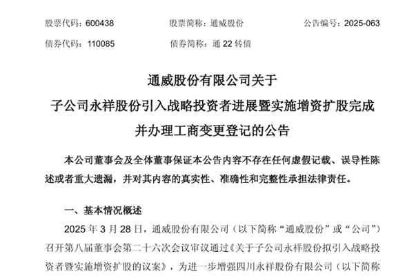7月3日,通威股份有限公司(简称:通威股份)公告称,其控股子公司四川永祥股份有限公司(下称“永祥股份”)已完成49.16亿元战略增资,并引入11家战略投资者,包括工银金融资产投资有限公司、中国中信金融资产管理股份有限公司等知名机构。此次增资以永祥股份增资前估值270亿元为基础,资金将用于偿还金融机构债务及补充流...