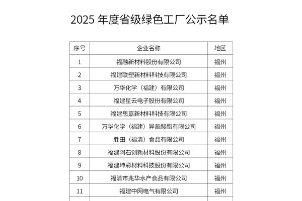 福建省工业和信息化厅关于2025年度省级绿色制造名单的公示 根据《福建省绿色制造梯度培育管理实施细则(暂行)》(闽工信规〔2025〕3号)要求,现将拟入选2025年度省级绿色制造名单进行公示,公示时间为2025年6月10日-6月16日,在此期间如有异议,可向我厅反映。 联系电话:省工信厅节能处,0591-87822241 省工信厅机...