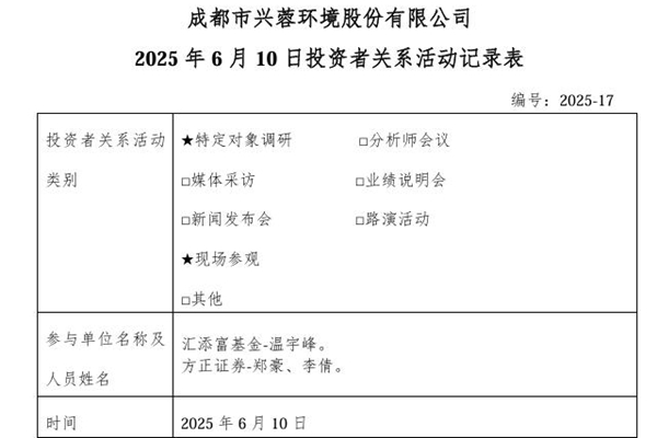 2025年06月10日,成都市兴蓉环境股份有限公司发布《2025 年 6 月 10 日投资者关系活动记录表》。图源:兴蓉环境公告 问题1:请介绍公司基本情况。 答:公司为国内领先的水务环保综合服务商,业务集投资、研发、设计、建设、运营于一体,拥有完善的产业链。业务板块主要包括:自来水业务、污水处理和中水利用业务、环保业务以及工程业...