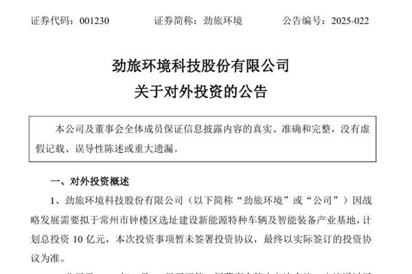 4月25日,劲旅环境科技股份有限公司(简称:劲旅环境)公告称,公司因战略发展需要拟于常州市钟楼区选址建设新能源特种车辆及智能装备产业基地,计划总投资10亿元,本次投资事项暂未签署投资协议,最终以实际签订的投资协议为准。 常州市钟楼区高新技术产业园(邹区镇)以新能源与智能装备制造为主导产业,市场需求持续增长,尤其是新能源特种车辆及智能...