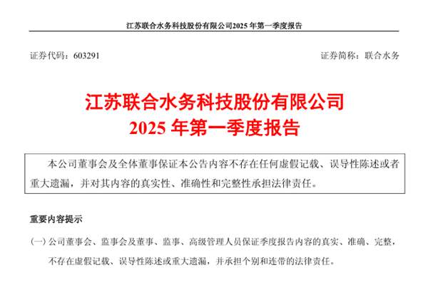 江苏联合水务科技股份有限公司(简称:联合水务)近日发布《2025年第一季度报告》。报告期内,联合水务实现营业总收入2.53亿元,同比增长7.47%;归母净利润1252.68万元,同比下降62.76%;扣非净利润820.94万元,同比下降52.09%;经营活动产生的现金流量净额为2195.19万元,同比增长5.31%;基本每股收益为0....