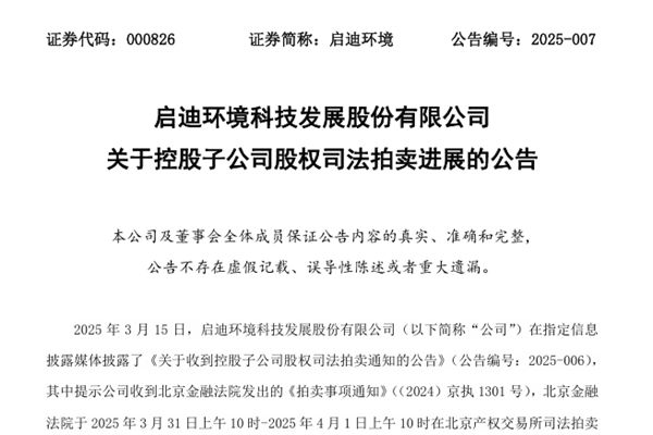 启迪环境科技发展股份有限公司(简称:启迪环境)4月2日公告称,因无人出价,控股子公司浙江启迪生态科技有限公司93.4190%的股权拍卖已流拍。 启迪环境认为,本次司法拍卖流拍事项不会对公司的生产经营产生重大影响。公司将根据后续进展情况,按照有关法律、法规及规范性文件的要求及时履行信息披露义务。图源:启迪环境公告 申明:本站发布此信...
