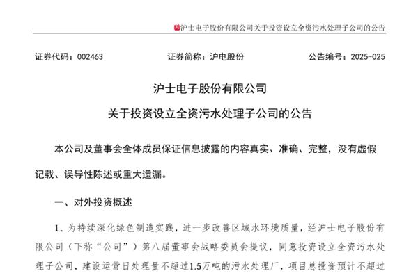 3月31日晚间,沪士电子股份有限公司(简称:沪电股份)披露投资设立全资污水处理子公司的公告。公告显示,为持续深化绿色制造实践,进一步改善区域水环境质量,经公司第八届董事会战略委员会提议,沪电股份同意投资设立全资污水处理子公司,建设运营日处理量不超过1.5万吨的污水处理厂,项目总投资预计不超过1.5亿元人民币,用于处理公司生产过程中产生...