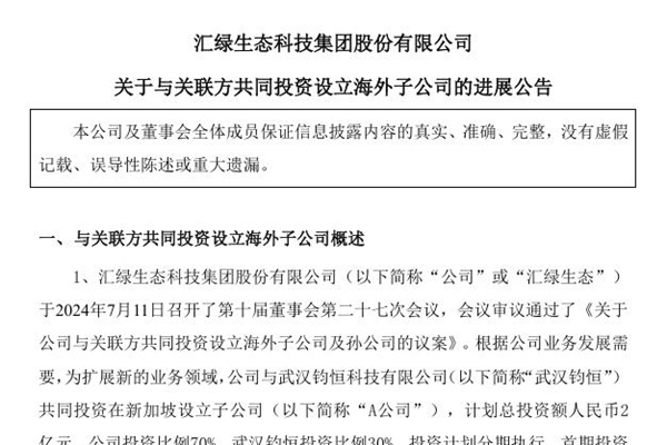 2025年02月14日,汇绿生态科技集团股份有限公司发布《关于与关联方共同投资设立海外子公司的进展公告》。图源:汇绿生态公告 公告表示,汇绿生态与武汉钧恒科技有限公司共同投资在新加坡设立子公司,计划总投资额人民2亿元,公司投资比例70%,武汉钧恒投资比例30%。公司的设立最终目的是由公司100%出资在马来西亚投资境外子公司,马来西亚...