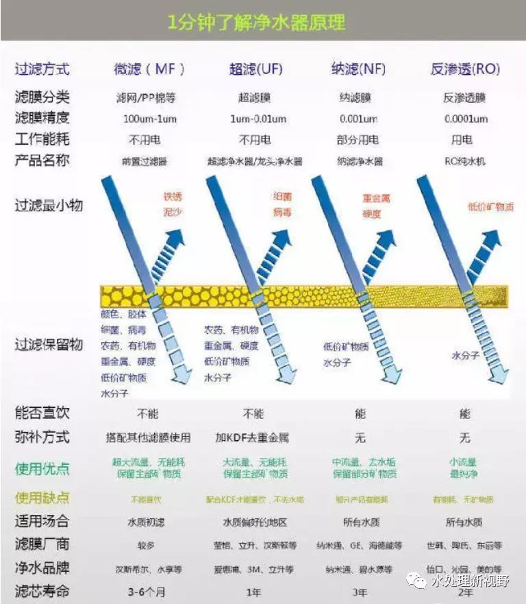 净水行业品牌众多,水处理方式复杂,有靠单一处理方式的,也有靠多种滤膜、滤料复合处理的。但是从技术的角度讲,万变不离其宗,今天小编就带你了解一下这个“宗”是怎么回事,让你对各种净水技术、配置、优劣一目了然。 1.家用、商用净水器原理 按滤膜的过滤孔径的精度和对溶解离子的去除能力分类,净水滤膜包括微滤、超滤、纳滤、反...