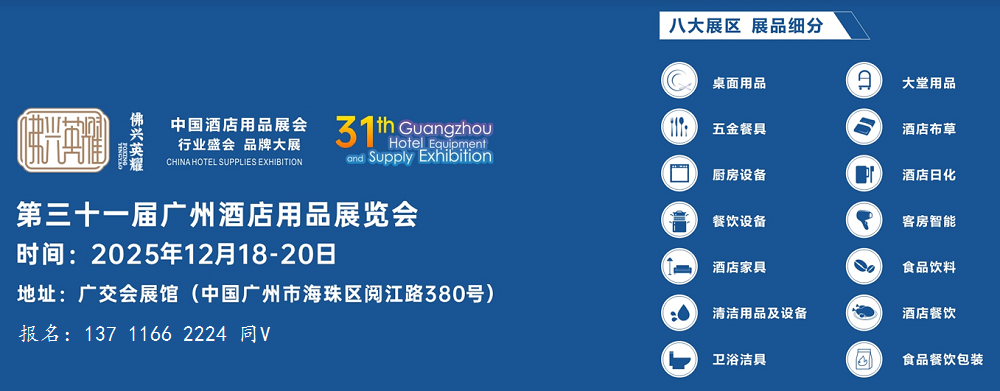 2025第三十一届广州酒店用品展览会 时间:2025年12月18日-20日 展会周期:一年一届第31届 主办单位:广东佛兴英耀展览服务有限公司 展馆名称:中国进出口商品交易会琶洲展馆 组展单位:广东佛兴英耀展览服务有限公司 展览面积:300000㎡ 展商数量:5000家 观众数量:500000人 2025第三十一届广州国际酒店用品展览会...