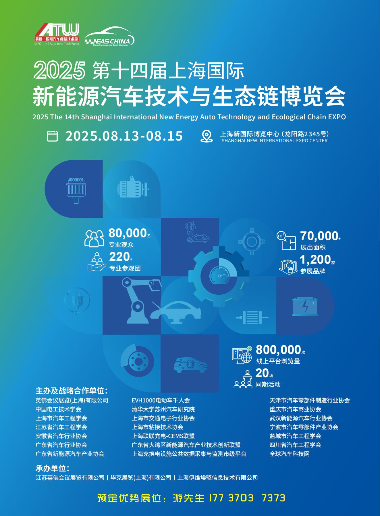 第十四届上海国际新能源汽车技术与生态链博览会 展会基本信息: 展会时间:2025年8月13日-15日 展会地点:上海新国际博览中心(浦东) 展出面积:70,000平方米 参展品牌:1200+ 观众数量:专业观众将超80,000名,220+专业买家团来自全球50多个国家和地区 组织机构: 主办及战略合作: 英佛会议展览(上海)有限公司 ...
