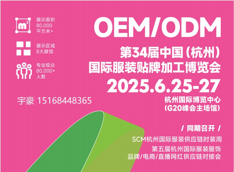 2025第34届杭州国际服装贴牌加工(OEM\ODM)博览会 杭州国际服装直播电商选品会 时间:2025年6月25日—27日 地点:杭州国际博览中心(G20峰会主会场) 【主办单位】浙江省针织行业协会 浙江省羊毛衫行业协会 杭州励业展览有限公司 【承办单位】上海励品展览服务中心 杭州格博会展有限公司 杭州励盛展览有限公司 【...