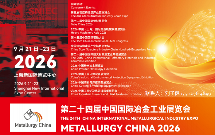 第二十四届中国国际冶金工业展览会 时间:2026年9月21日-23日地点:上海新国际博览中心 主办单位: 中国钢铁工业协会 中国国际贸易促进委员会冶金行业分会 承办单位: 冶金工业国际交流合作中心 汉诺威米兰展览(上海)有限公司 展会介绍 第二届中国国际钢铁周重点系列活动之一—第二十四届中国国际冶金工业展览会将于 2026 ...