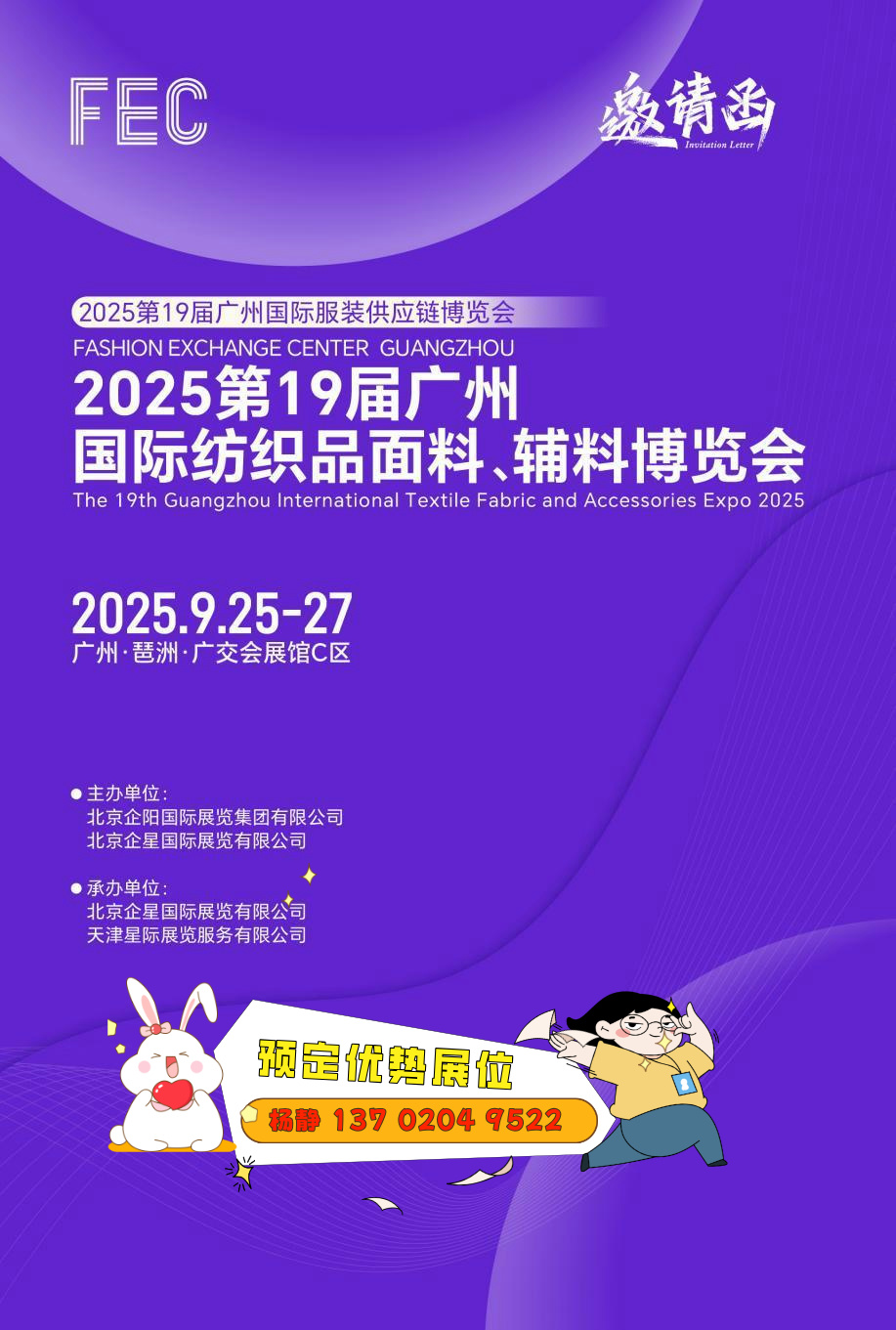 2025 9届广州国际纺织品面料、辅料博览会 The 19th Guangzhou International Textile Fabric and Accessories Expo 2025展览时间:2025年9月25-27日 展览地点:广州琶洲广交会展馆 主办单位:北京企阳国际展览集团有限公司 北京企星国际展览有限公司 承办单位:北...