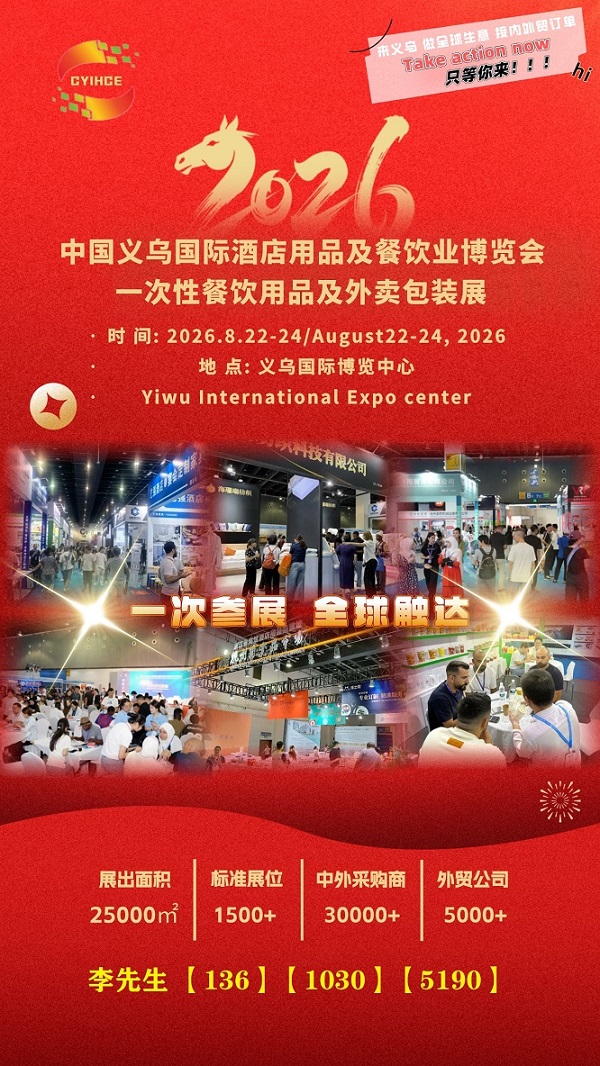来义乌,做全球生意,接内外贸订单 一次参展·全球触达 2026中国义乌国际酒店用品及餐饮业博览会 一次性餐饮用品与外卖包装展 展位火热抢订中... 2026中国义乌国际酒店用品及餐饮业博览会将于8月22-24日在义乌国际博览中心盛大启幕!本届博览会依托义乌“世界超市”的全球贸易优势,特设&ldquo...