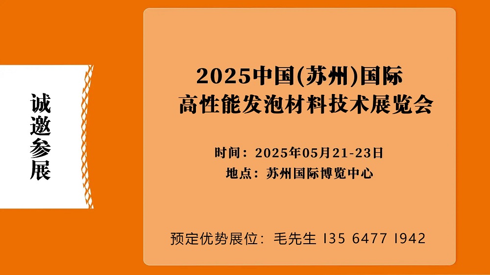 2025中国(苏州)国际高性能发泡材料技术展览会 CHINA (SUZHOU) INTERNATIONAL HIGH PERFORMANCE FOAM MATERIAL TECHNOLOGY EXHIBITION 时间:2025年5月21-23日 地点:苏州国际博览中心(苏州工业园区苏州大道东688号) 【展会介绍】 随着全球对可持续发...