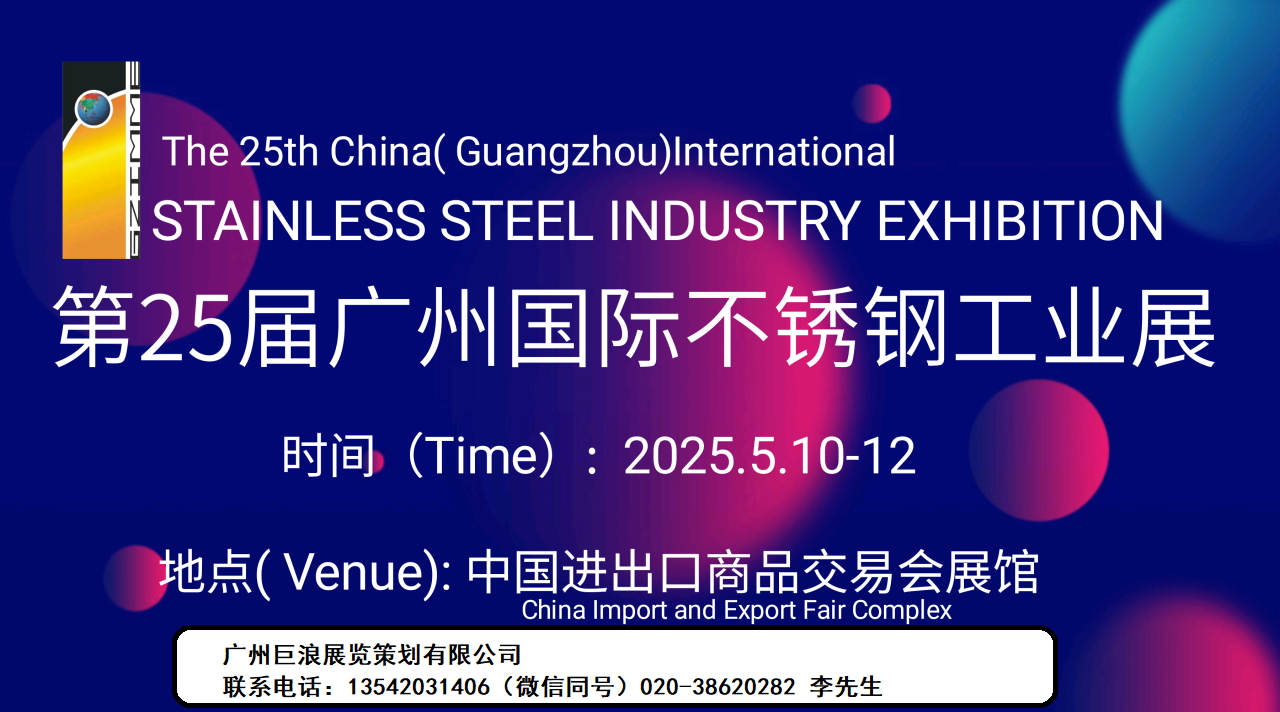 第二十五届广州国际不锈钢工业展 邀请函 主办单位: 广州巨浪展览策划有限公司 一年一度的广州国际不锈钢工业展,是久负盛名、全球瞩目的业界盛会,展会展出面积将达到30000㎡,展商来自国内外近300家不锈钢工业企业,本次展会展商来自国内外近800家金属暨冶金工业企业。其中有宝武、太钢、东北特钢、酒钢、浦项、湘钢、鞍钢联众、天津冶金、中兴盛...