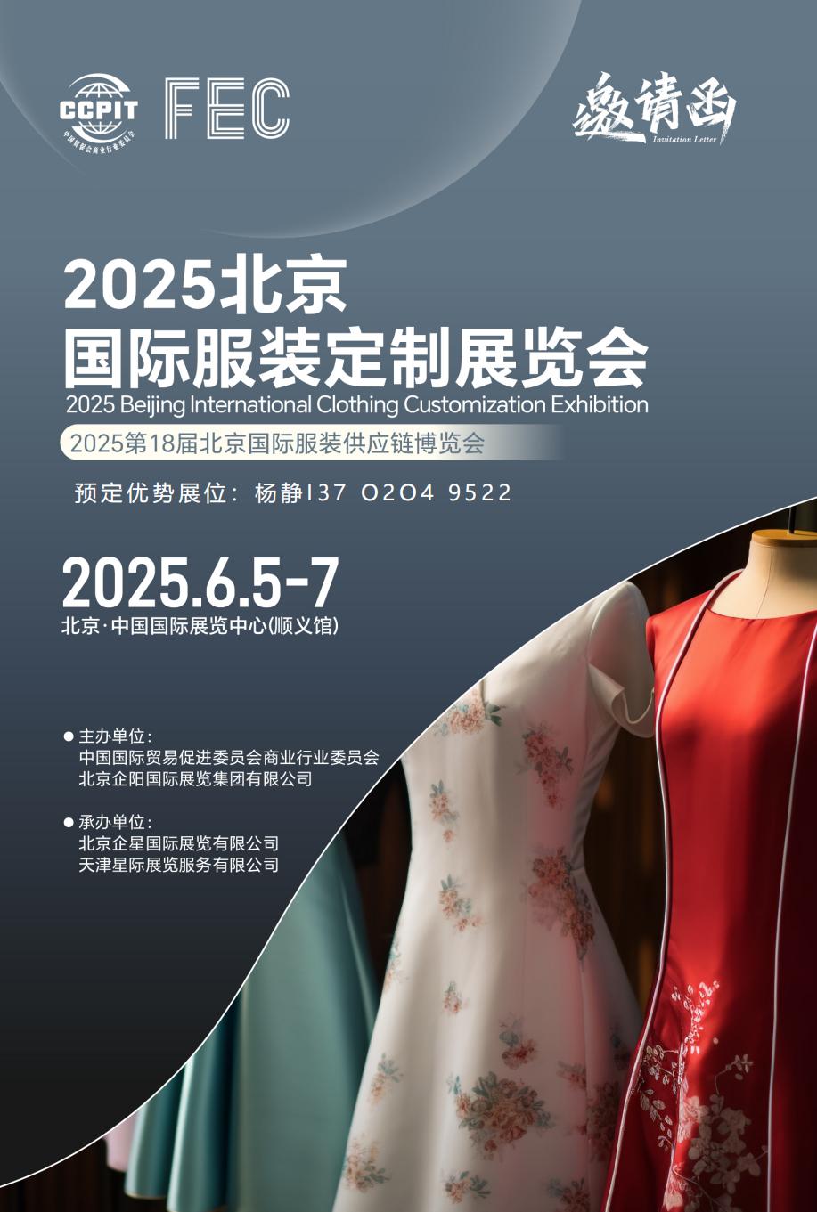 FEC 2025北京国际服装定制展览会 2025Beijing International Clothing Customization Exhibition 展览时间:2025年6月5-7日 展览地点:北京·中国国际展览中心(顺义馆) 主办单位:中国国际贸易促进委员会商业行业委员会 北京企阳国际展览集团有限公司 承办单...