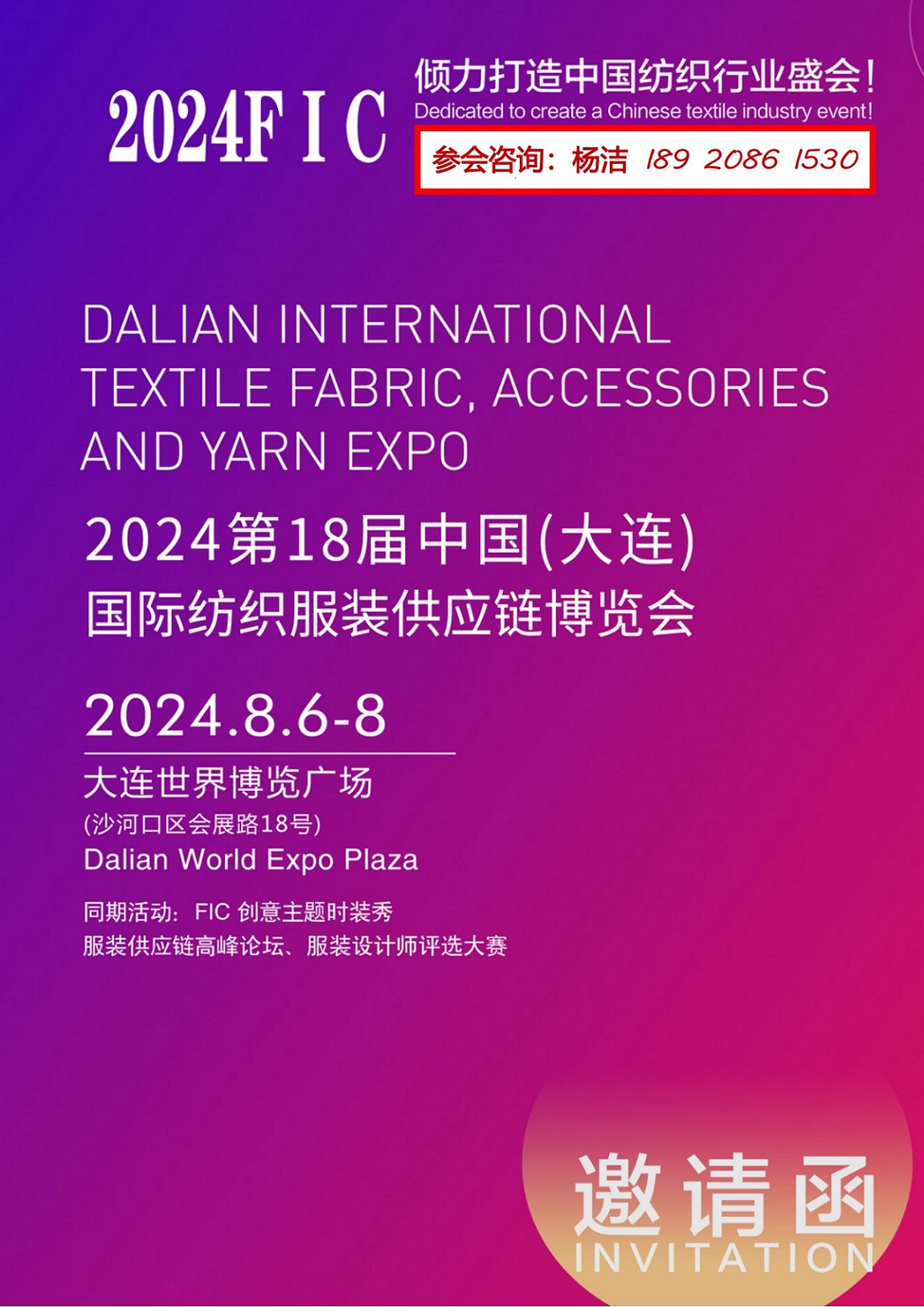 2024第18届中国(大连)国际纺织服装供应链博览会 The 18th Dalian International Textile and Garment Supply Chain Expo 2024 开展时间:2024年8月6-8日 展览地点:大连世界博览广场(沙河口区会展路18号) 支持单位:天津市服装商会 河北省服装行业协会 承...