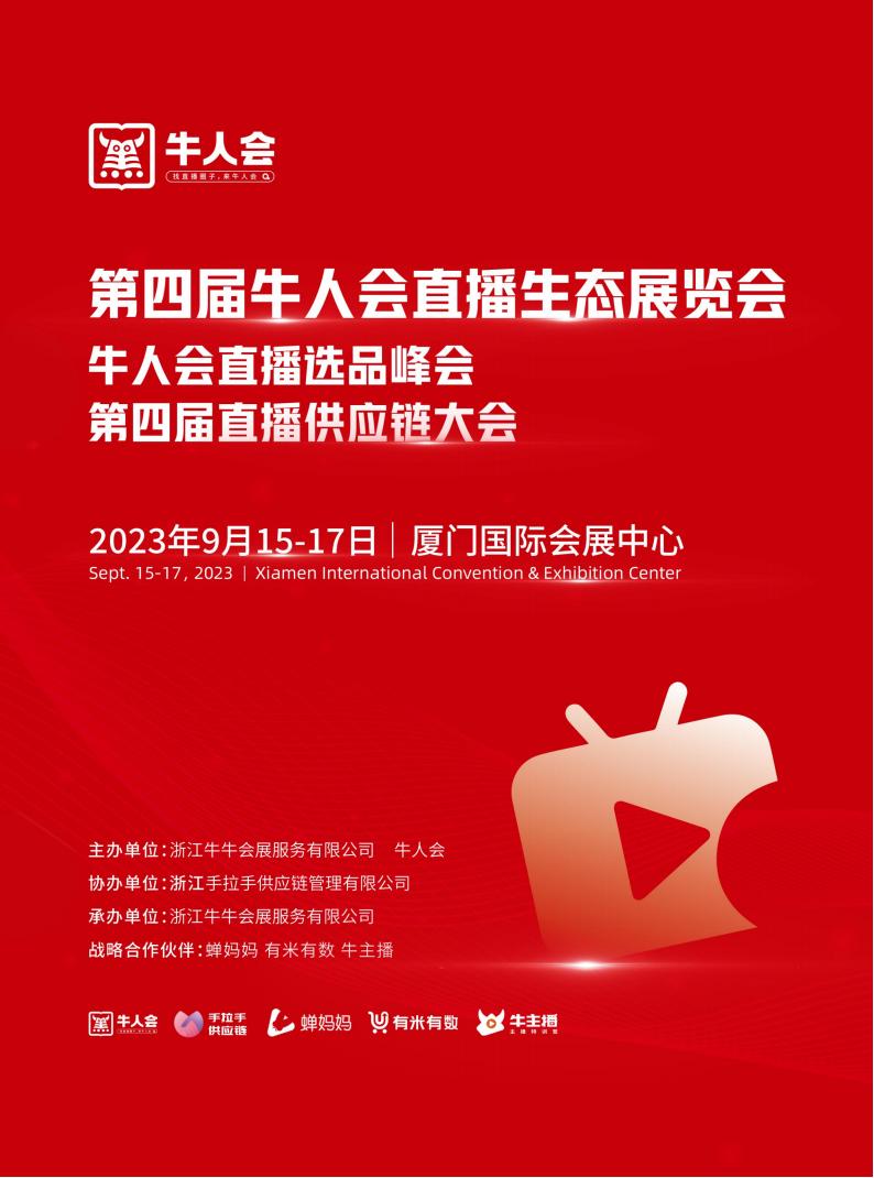 第四届牛人会直播生态展览会 牛人会直播选品峰会第四届直播供应链大会2023年9月15-17日|厦门国际会展中心 主办单位:浙江牛牛会展服务有限公司牛人会协办单位:浙江手拉手供应链管理有限公司承办单位:浙江牛牛会展服务有限公司战略合作伙伴:蝉妈妈有米有数牛主播 缩短链路提高效率—直播电商与品牌实现共创共赢随着互联网技术的发展...